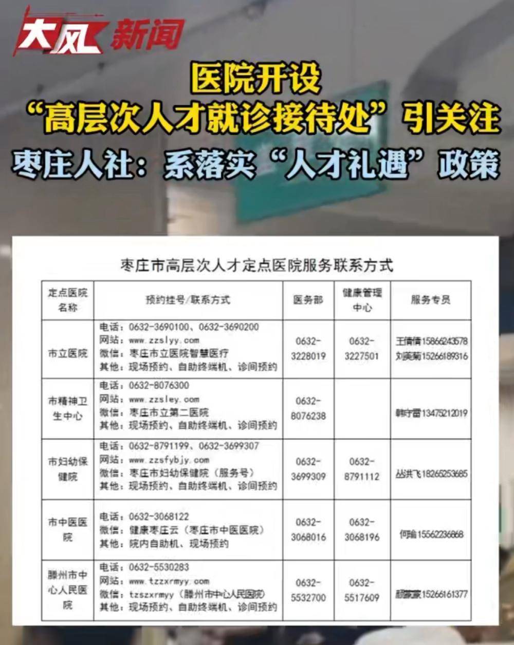 华商报大风新闻记者查询到,枣庄市人社局曾发布《枣庄市高层次人才绿色通道之医疗健康服务事项清单》,其中提到,高层次人才凭“山东惠才卡”“枣庄惠才卡”可享受枣庄市内5家定点医院预约就诊、专员陪同、专家诊疗的就医绿色通道服务,此举是为了持续优化人才发展生态,进一步畅通高层次人才服务绿色通道,落实人才礼遇政策。